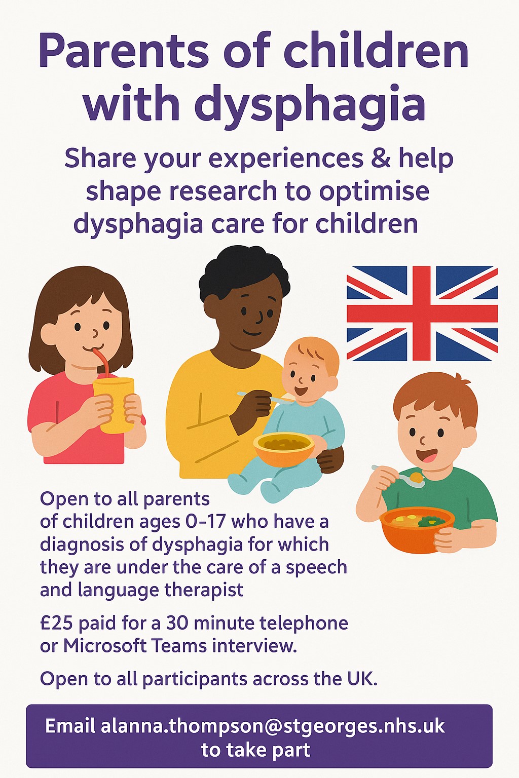 30 minute interview opportunity via MS Teams video call. All parents of children with dysphagia aged 0-17 welcome. Interviews will be about your lived experiences with your child’s swallowing difficulties, including their journey to being diagnosed with dysphagia. Help shape research questions and the study design of future research on paediatric dysphagia.